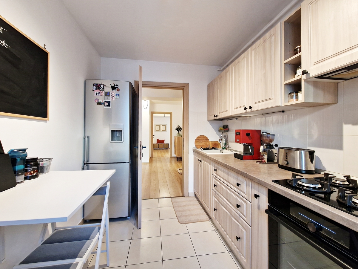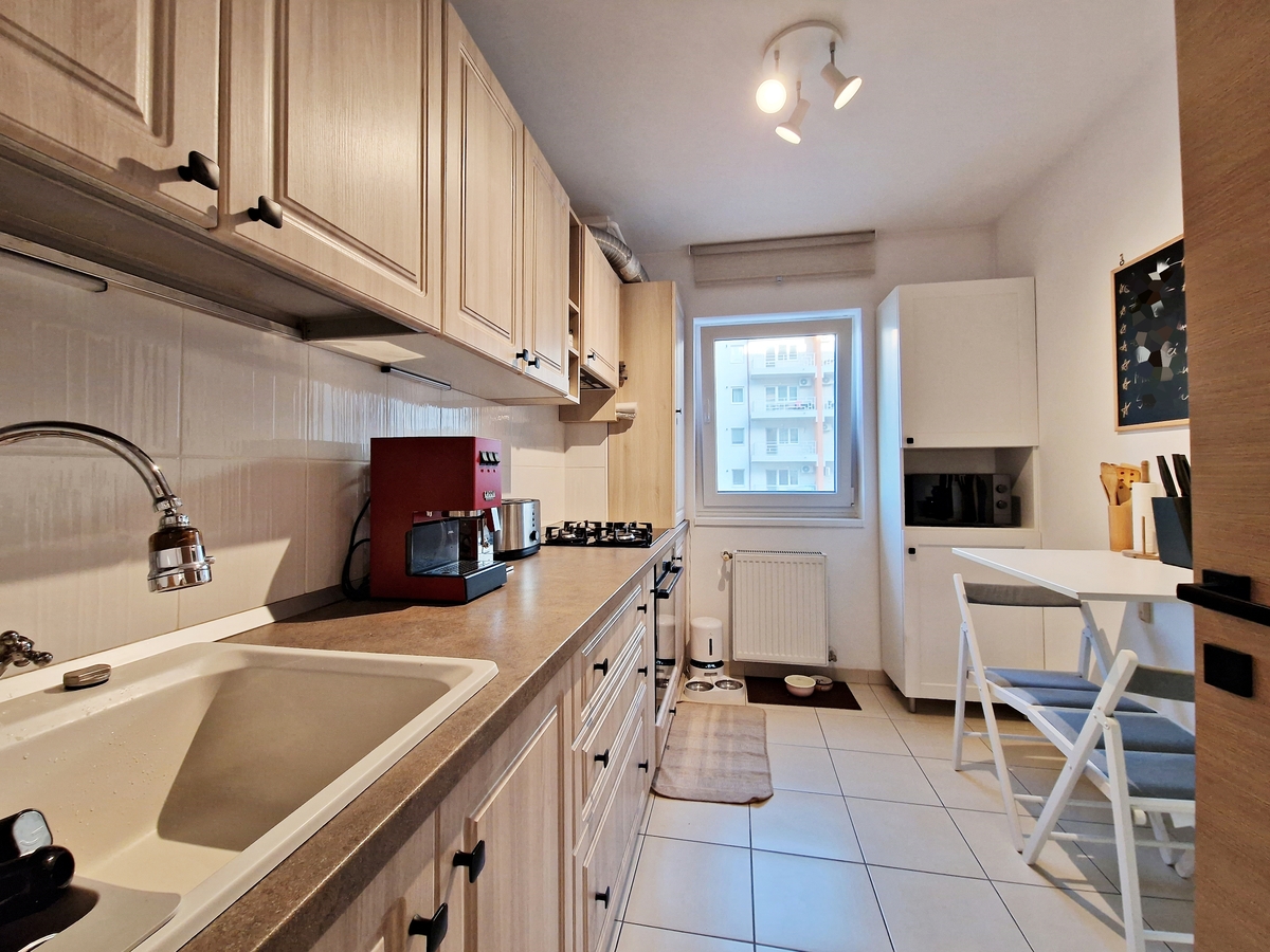 Bucataria moderna si utilata complet, separata de living, cu o suprafata potrivita de peste 7 mp, ofera suficient spatiu pentru lucru si depozitare, chiar si pentru un loc de servit rapid masa in doi.
