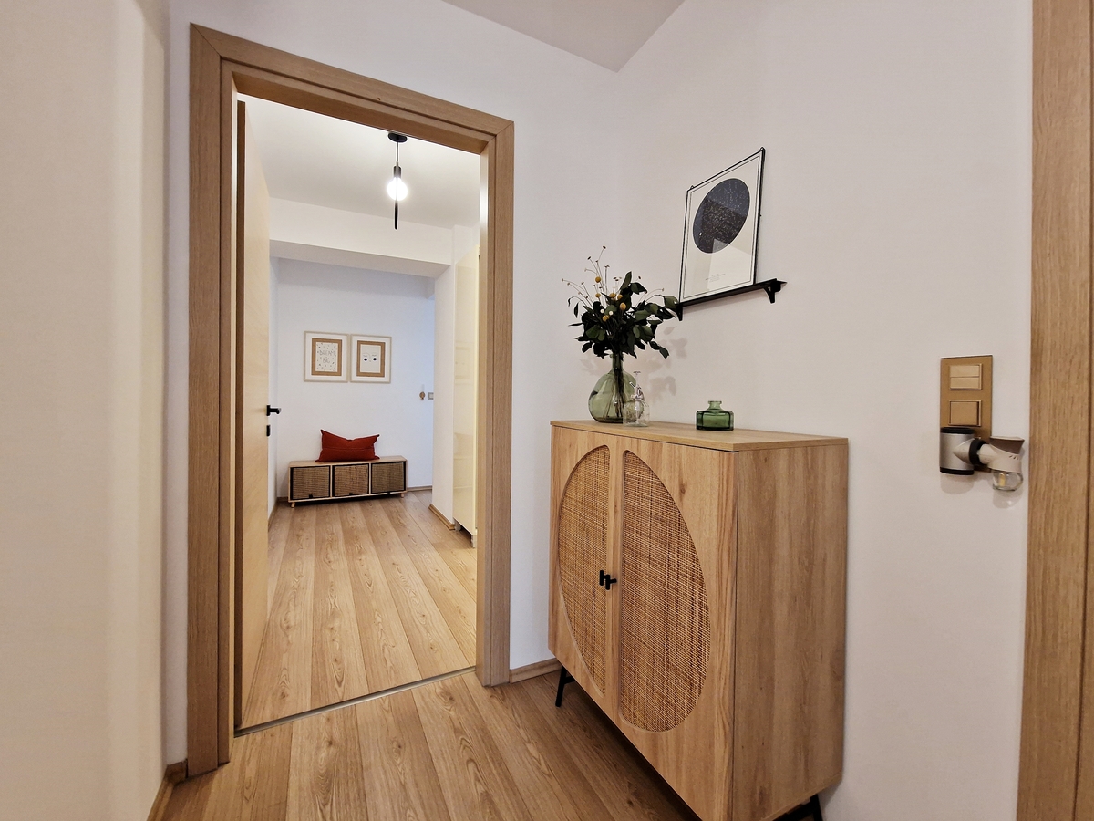 Inca de la intrare, simti echilibrul dintre eleganta si functionalitate. Holul central generos de 12 mp se deschide spre un living luminos de aproximativ 17 mp, unde lumina naturala inunda fiecare colt, iar mobilierul ales cu gust creeaza o senzatie de relaxare si rafinament. Este acel loc in care serile cu familia, filmele preferate sau mesele cu prietenii se transforma in momente memorabile.