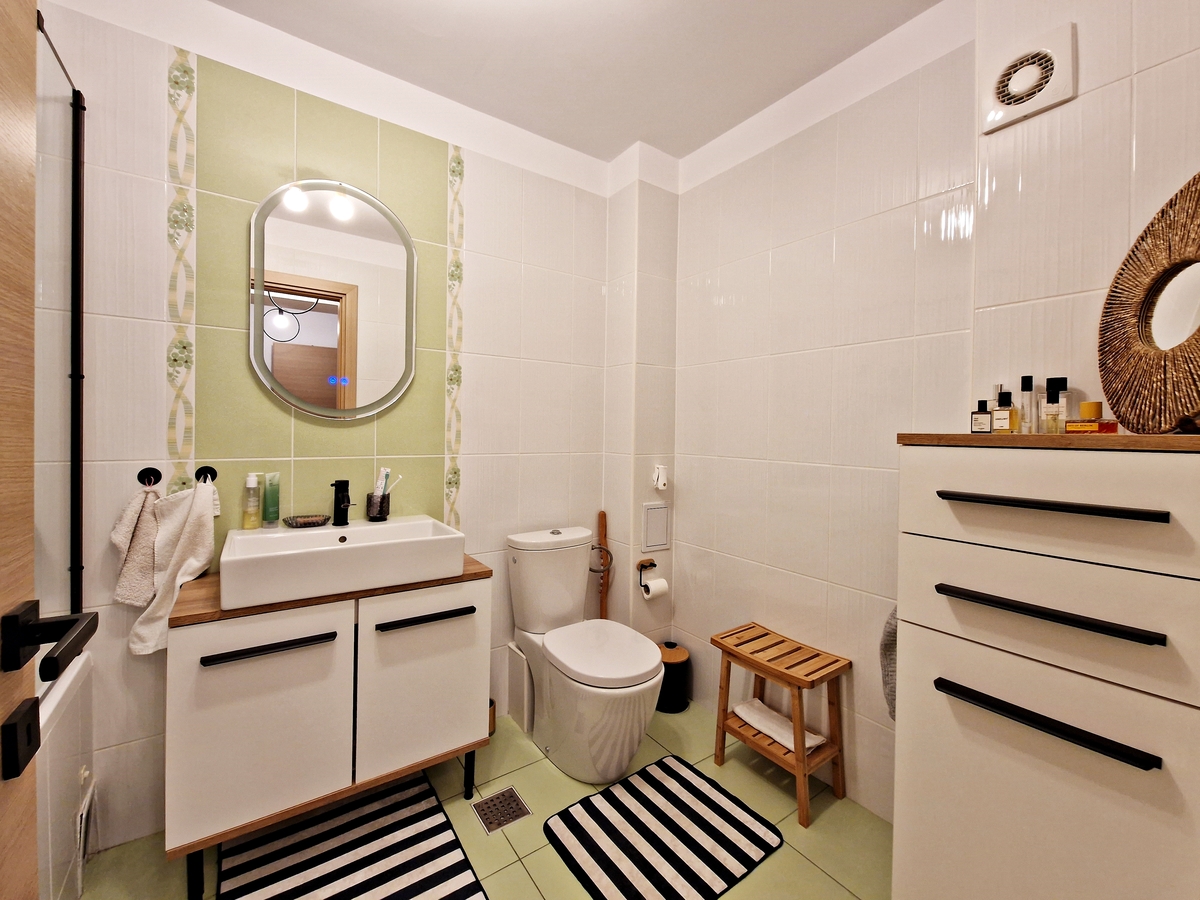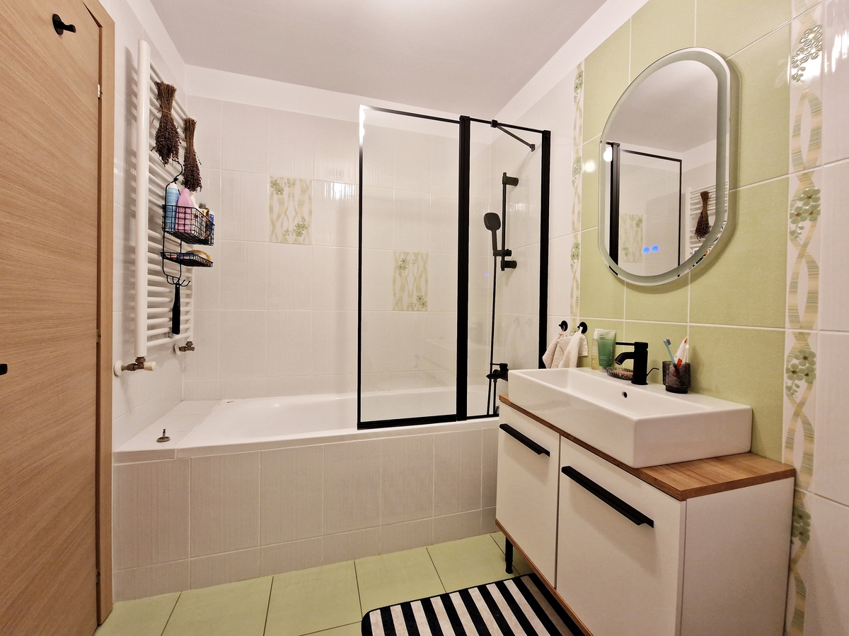 Cea de-a doua baie este de asemenea spatioasa (5,70 mp), dotata cu cada si deserveste atat zona de zi, cat si dormitorul secundar.