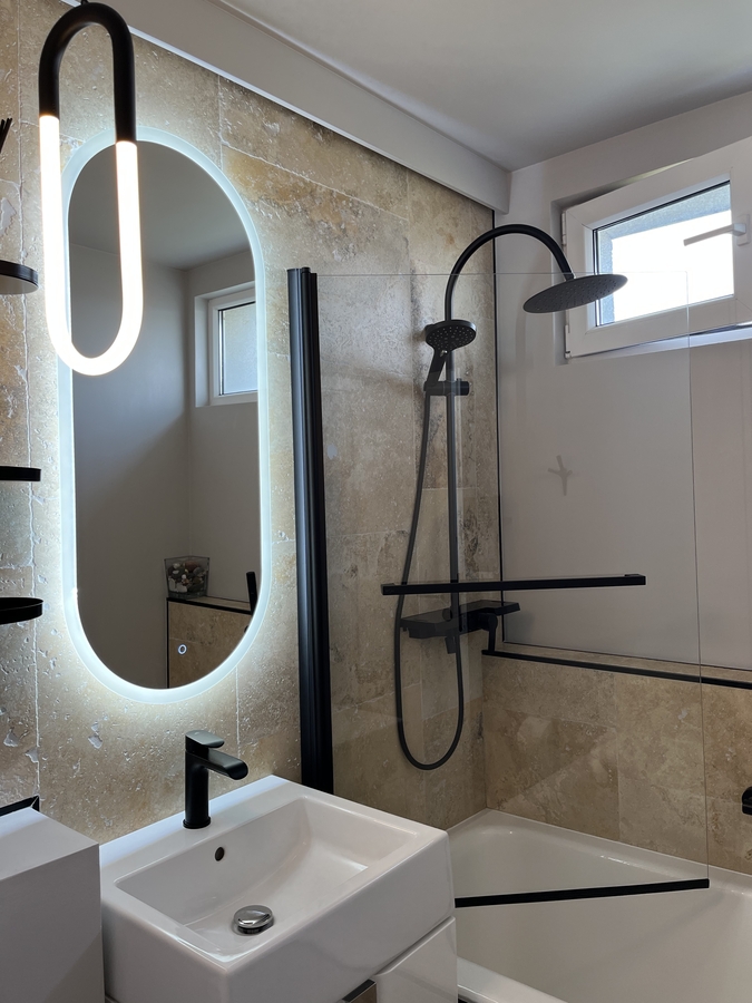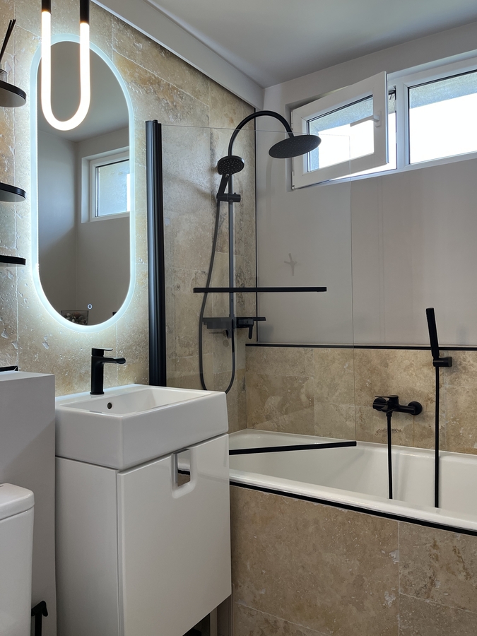 • Baia placata cu piatra naturala - travertin, cada din fonta