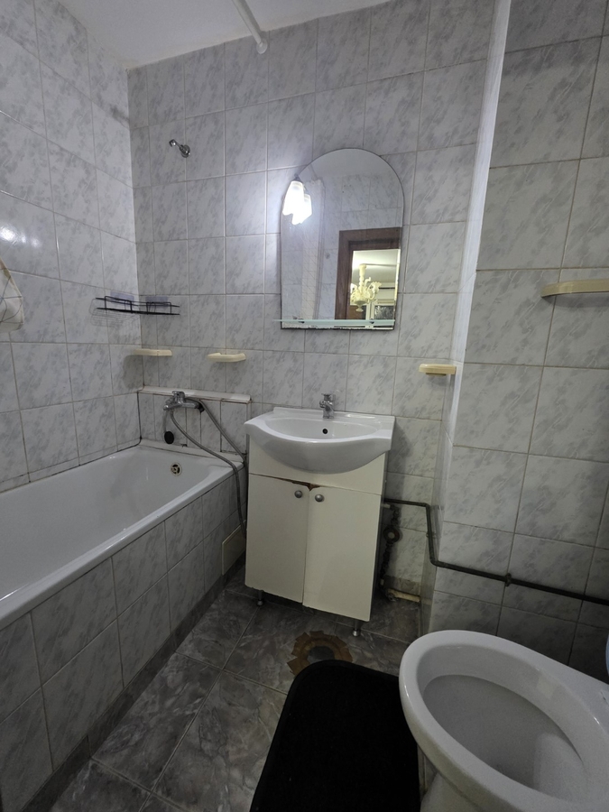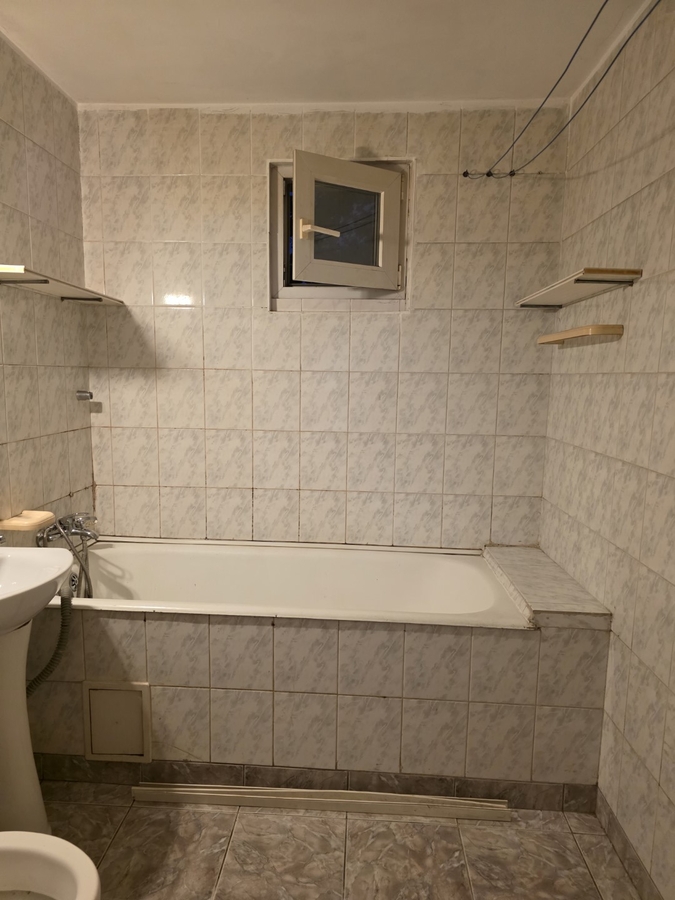 Apartamentul este la etajul 1, are 2 grupuri sanitare, unul cu geam, gresie, faianta, usa metalica.