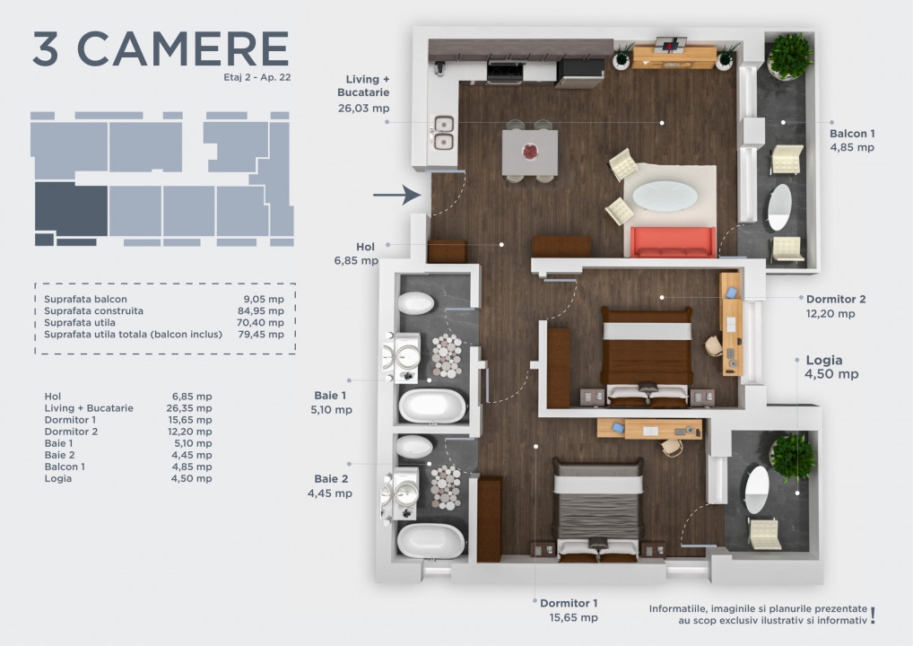 Va prezentam pentru vanzare un apartament de 3 camere, situat la etajul 1, intr-un ansamblu rezidential foarte atractiv si bine planificat, oferind o gama variata de locuinte pentru diferite nevoi si preferinte. Proiectul ofera o gama variata de tipuri de locuinte, inclusiv apartamente cu 3 camere, 2 camere, 1 camera.
