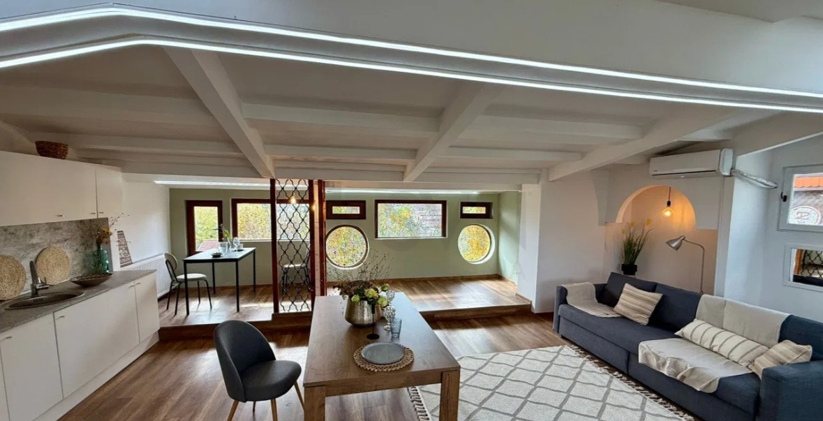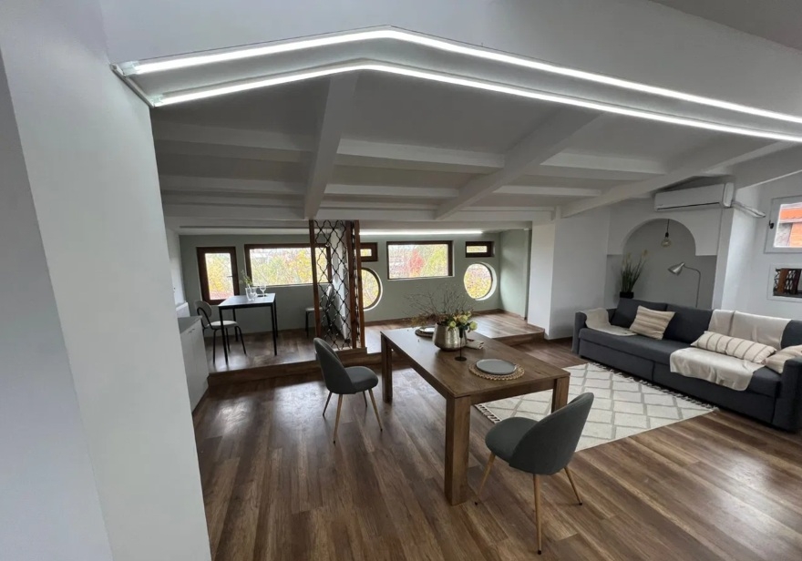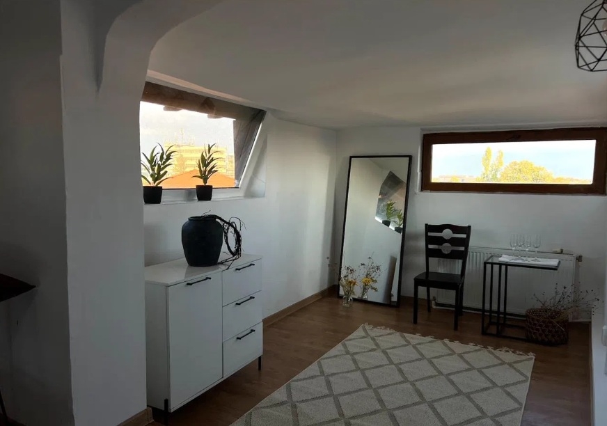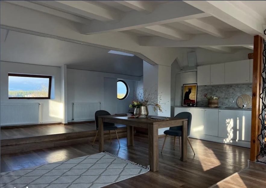 Mansarda minunata, vedere panoramica asupra orasului Bucuresti si padurea Baneasa, geamuri spre cer, trei dormitoare, trei bai, living spatios cu bucatarie deschisa (70 mp doar livingul)
