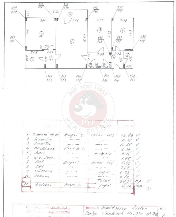 Podele: parchet, gresie | Pereti: faianta, lavabil | Ferestre: pvc