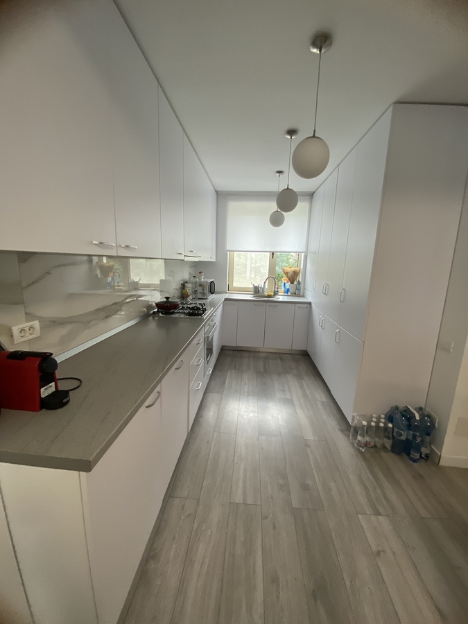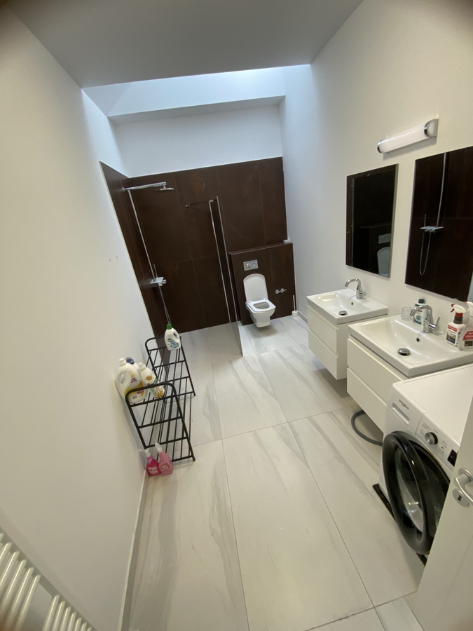 La parter avem livingul generos cu bucatarie deschisa, utilata cu frigider, masina de spalat vase, plita+ cuptor, loc de luat masa , spatiu depozitare, baie si un birou cu baie proprie.