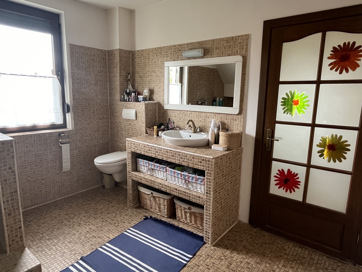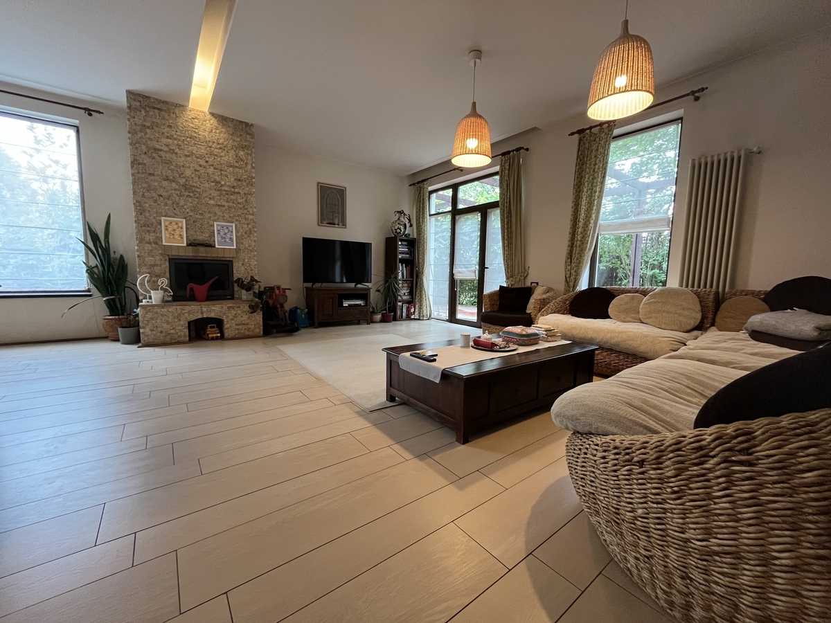 Mogosaia.Strada asfaltata si acces usor catre mijloace de transport in comun, intre lac si padurea Mogosoaia-Chitila, casa a fost construita pentru uz personal, este locuita si in prezent, individuala, cu subsol, parter si mansarda pe placa de beton. Acoperita cu tigla , decorata cu piatra naturala pe exterior, podele-dusumea, mobilier-lemn masiv, casa este calda si primitoare. Tavanele sunt inalte. Se vinde mobilata si utilata. Living spatios cu semineu si mobilier de ratan, bucatarie clasica, 3 dormitoare, 3 bai renovate, dressing si birou. Subsolul are 50 mp si e format din camera tehnica, camara si uscatorie, cu acces din interior si exterior. Gradina are 400 mp, este un spatiu intim de relaxare cu vegetatie matura.