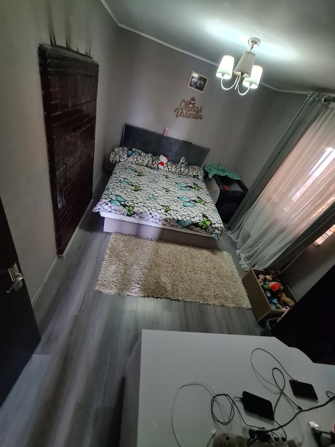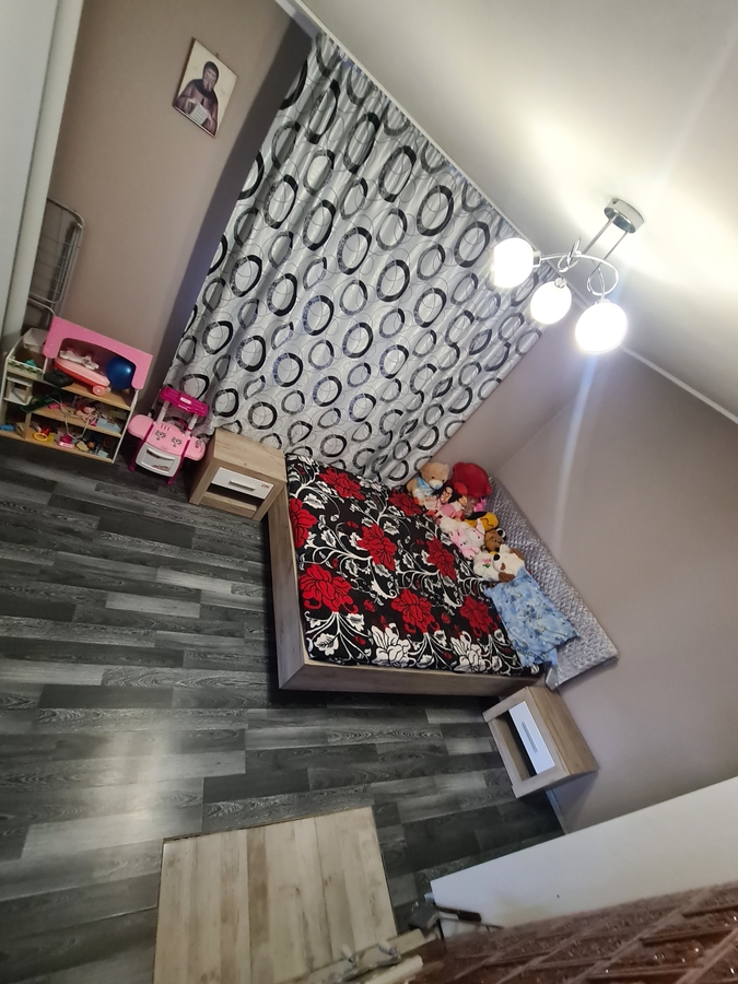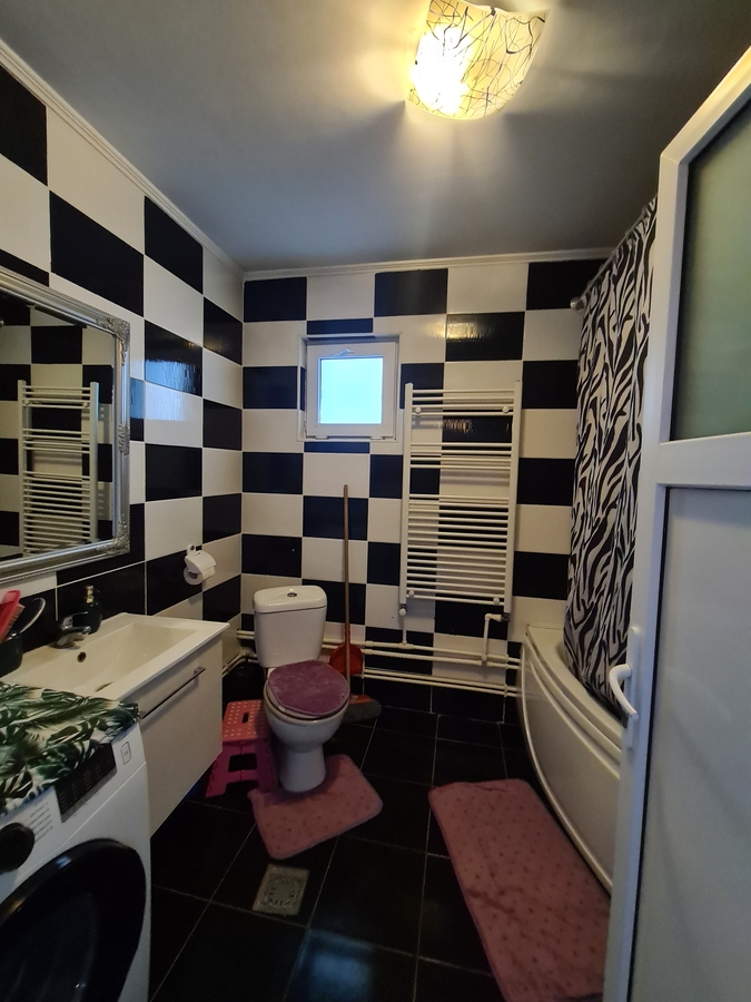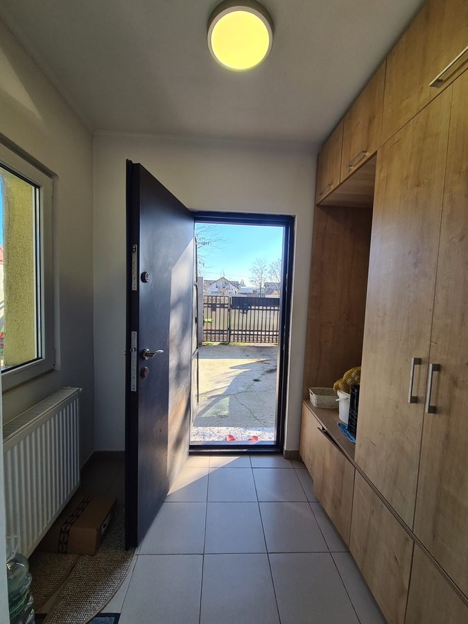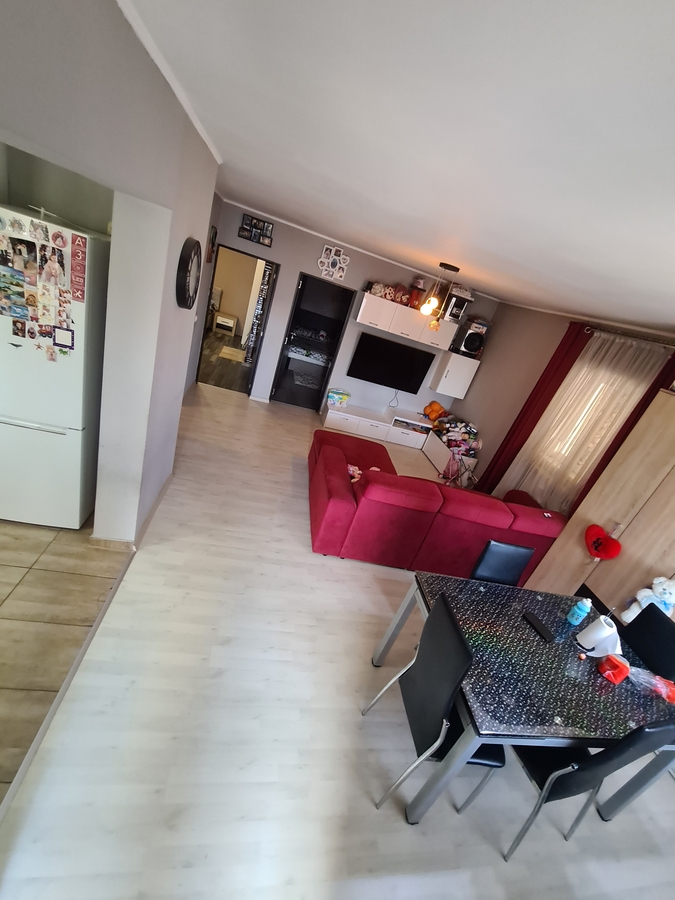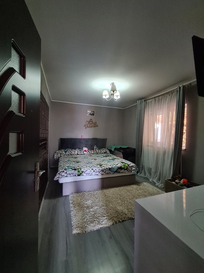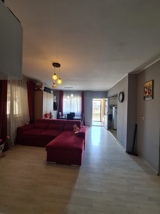 Spatiul interior se remarca printr-un living generos, conceput in stil open-space impreuna cu bucataria, creand un cadru luminos, primitor si perfect pentru momentele petrecute in familie. Accesul catre cele doua dormitoare se face direct din living, ceea ce confera locuintei o fluiditate aparte si o atmosfera calda. Confortul este garantat prin existenta unei centrale electrice eficiente, care asigura un climat placut pe tot parcursul anului.