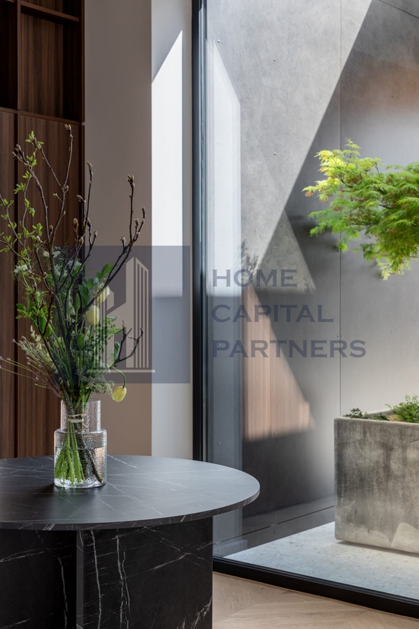 In interior, spatiile se deschid firesc unul catre altul. Livingul amplu, cu tavan inalt, comunica vizual cu zona de dining si bucataria premium complet echipata, iar in centrul compozitiei se afla un atrium cu vegetatie naturala – un detaliu arhitectural rar, care aduce natura literalmente in mijlocul casei.