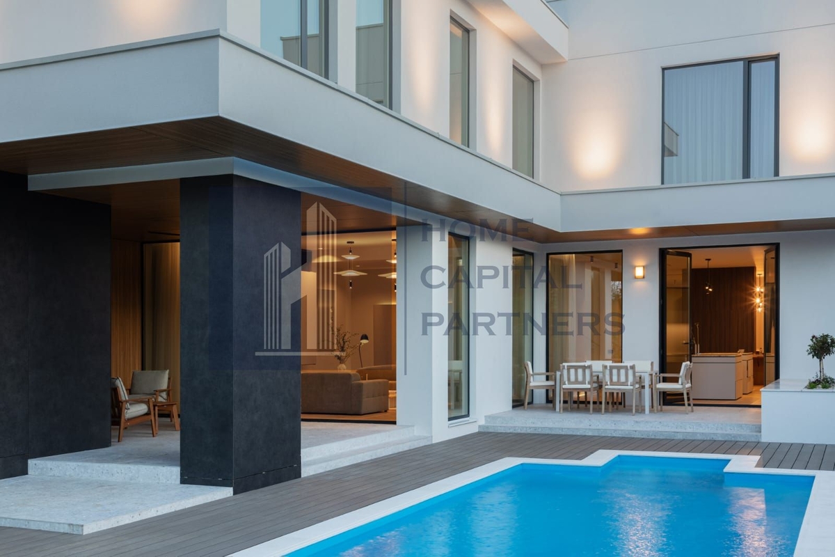 Arhitectura minimalista, cu volume curate si materiale naturale, ofera senzatia de spatiu si claritate vizuala. Fatada, dominata de linii orizontale si tonuri neutre, este pusa in valoare de un iluminat arhitectural subtil, iar gradina – amenajata profesionist – creeaza o atmosfera de resort urban, cu piscina privata, zona de dining exterior si colturi de relaxare.