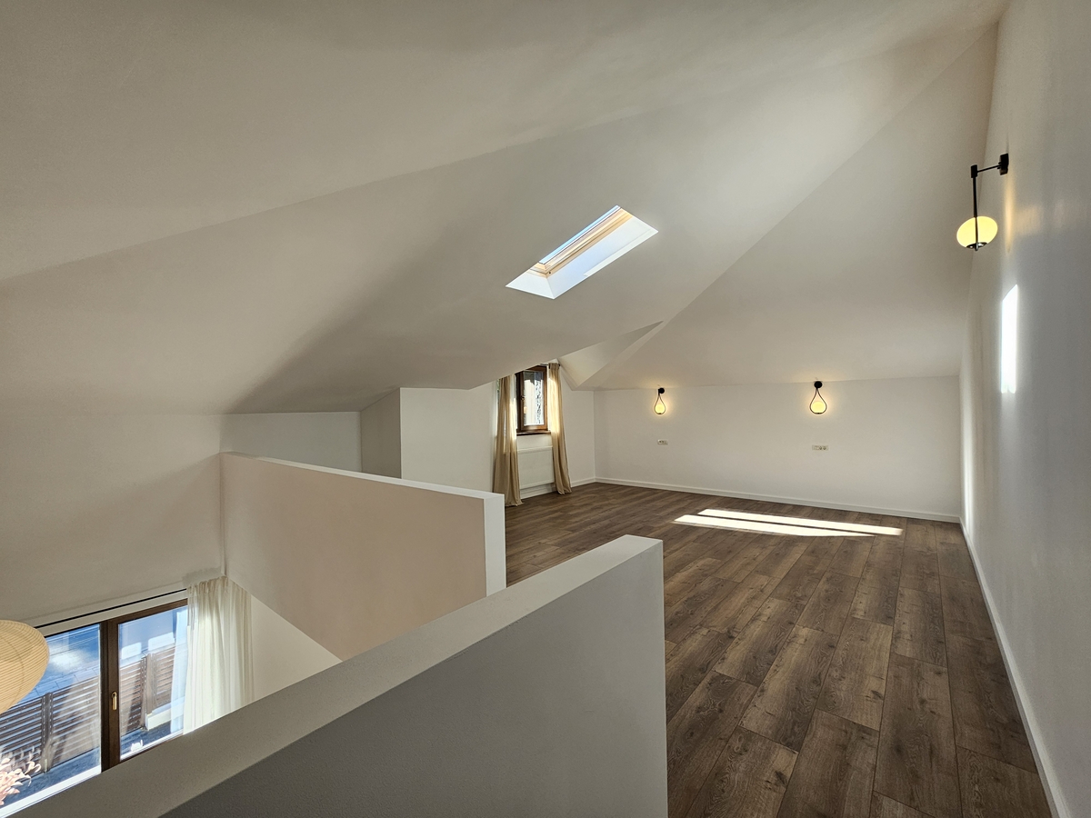 Cele 3 dormitoare au suprafete generoase, fiecare cuprinzand doua zone (cea de zi, situata la etaj si cea de noapte, situata la mansarda).