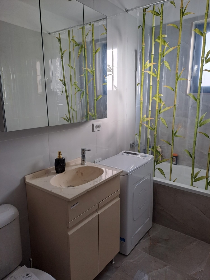 In bucatarie mobila este deasemeni pe comanda cu dulapurile suspendate cu 5 usi, inalte de 130 cm pana in tavan. Frgiderul si aragazul noi, inca in garantie.