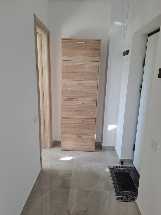 In hol avem pantofar inalt de 2 metri, cu 6 comparimente, canapea extensibila 140 x 200, deasupra este amenajat un dulap cu 7 usi, inalt de 130 cm, pana in tavan pentru a mari spatiu de depozitare. In fata canapelei este montat suspendat un televizor cu diagonala 81 cm.