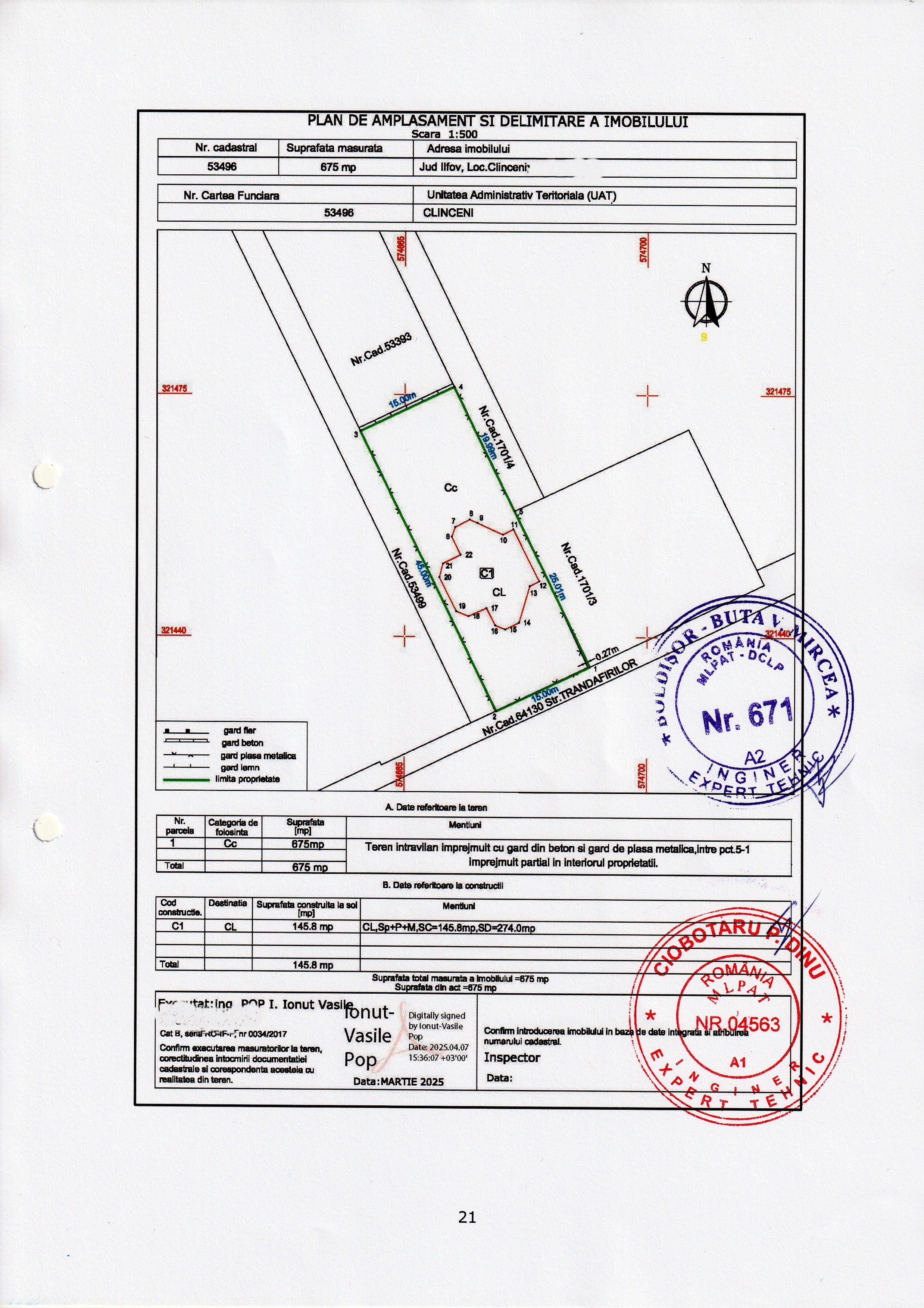 Vanzare teren situat in Com. Clinceni jud. Ilfov, Str. Ciocarliei, suprafata 675 mp + 89,9925mp cota parte indiviza in proprietate din drumul de sevitute, cu deschidere 15m si casa Sp+P+M construita in 2008, din structura metalica, in stare de coservare si usor degradabila (nefiind locuita niciodata), imobilul beneficiind de toate utilitatile. Conform expertizei tehnice efectuata in luna iunie 2025, privind starea fizica a constructiei cu functiunea de locuinta unifamiliala Sp+P+M (corp C1), imobilul are urmatoarele suprafete si date tehnice: