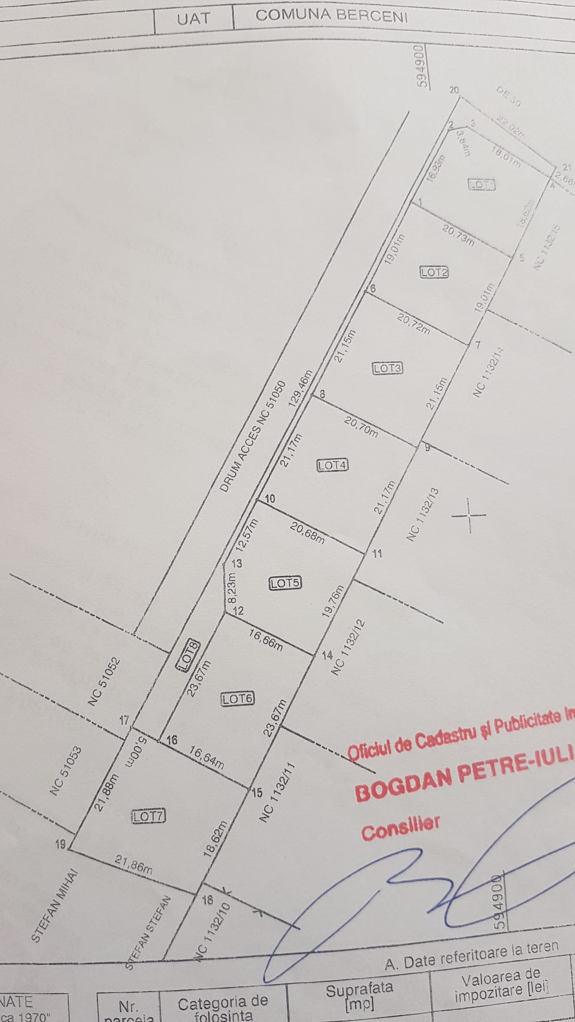 Vanzare teren intravilan Comuna Berceni, zona Str. Ciulini, posibilitate contructie P+1, utilitatile la strada,gaz, curent, apropiere centre comerciale, mijloace transport, cadastrat intabulat, 120euro/mp. Lotul nr 7