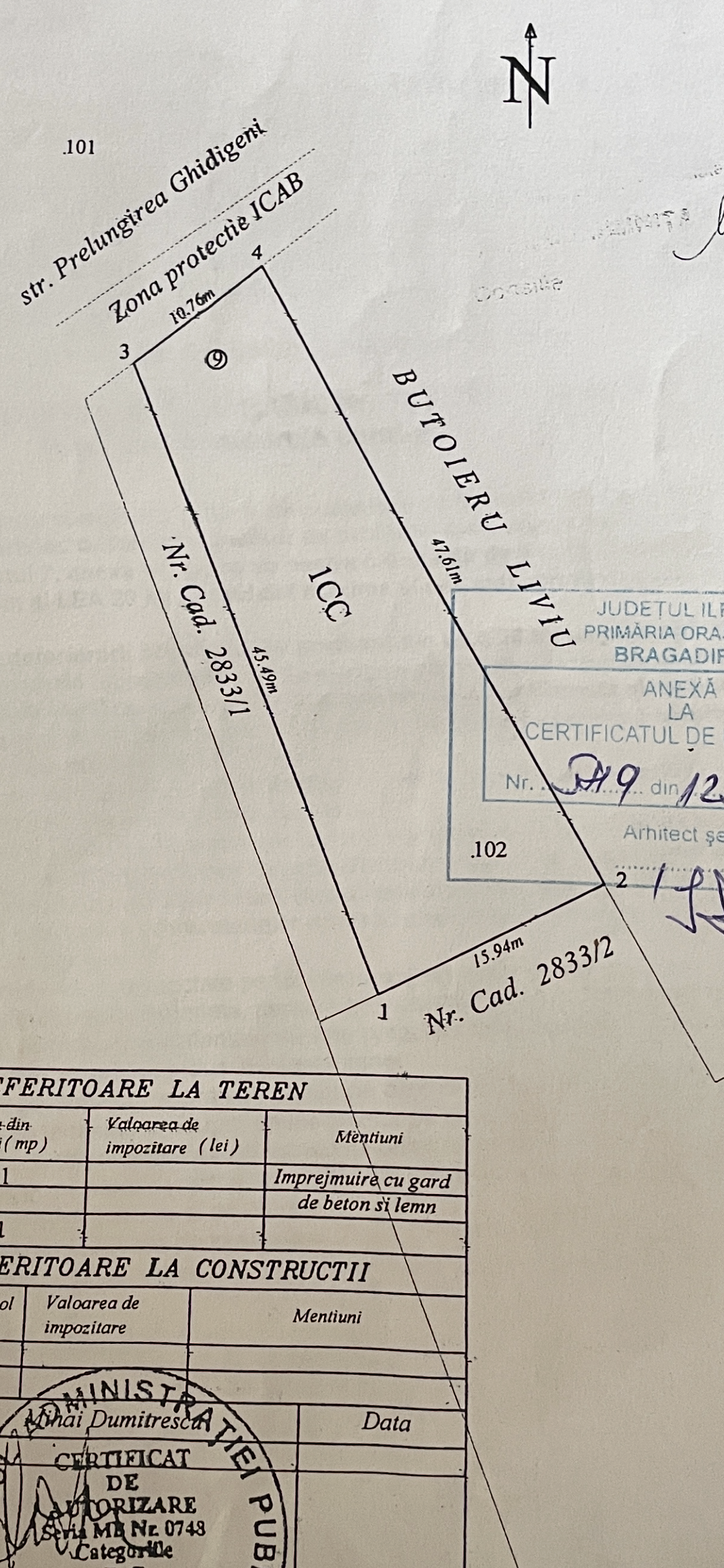 se vinde teren intravilan construibil,600mp,deschidere la strada ghidiceni de 10,76m,deschidere spate teren de 15,94m,situat pe strada ghidiceni intersectie cu drumul ghindari.terenul este inprejmuit,are gaze ,curent ,canalizare la poarta si este intabulat.