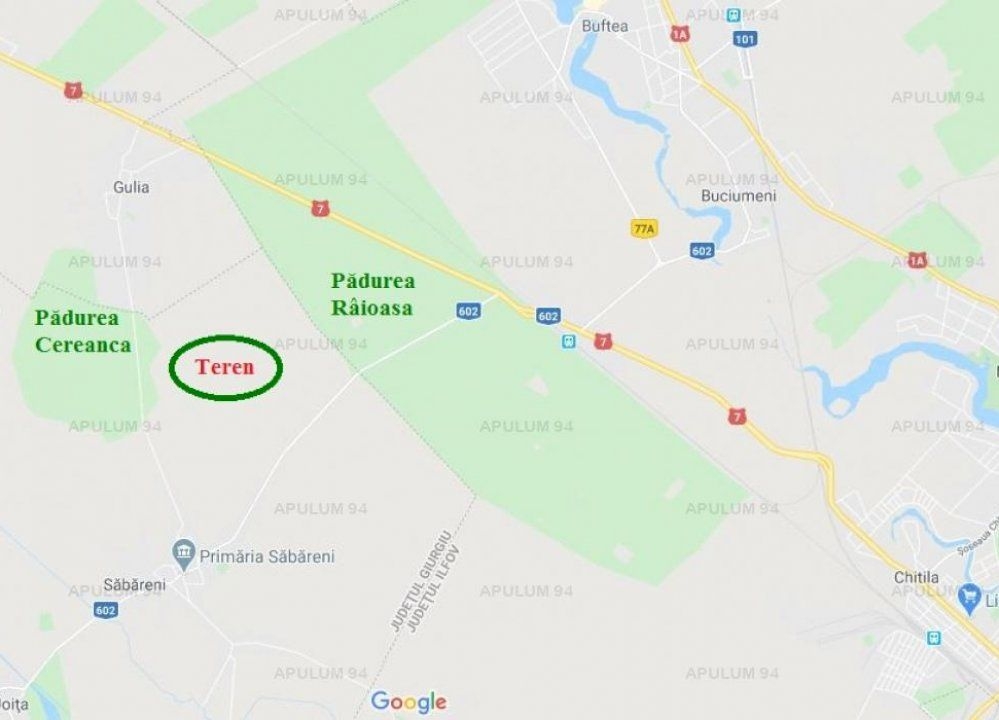 In Sabareni, la 11 km de Centura Bucurestiului, intre cele 2 paduri: Raioasa si Cereanca, in planul 2, retras fata de DJ602, intr-o zona ferita de poluare, locatie potrivita constructiilor rezidentiale sau de agrement. Terenul este intravilan si are o suprafata de 16.400 mp cu 2 Fronturi stradale (la ambele capete) de cate 43 m. Pret 246.000 EUR (15 EUR/mp) Comision 0.